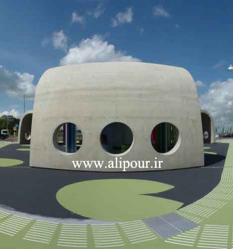 ساختار اصلی ساختمان پوسته بتنی با شکل مقعر است که به سه طرف تا زمین امتداد دارد. امکانات داخلی سرویس بهداشتی و ... در پوسته ای فلزی قرار دارد.