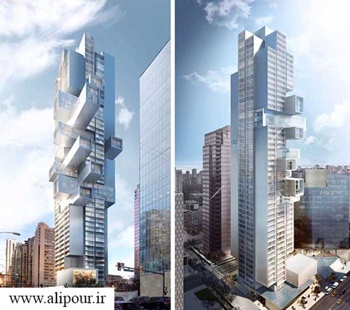 معماری این آسمان خراش با ایده ی ایجاد گشودگی هایی در محور عمودی آن پدید آمده است، به گونه ای که مانند مجسمه ای پذیرای شهر و طبیعت در سه بعد باشد. برج در خیابان اصلی شهر ونکوور و در محل برخورد محورهای اصلی شهر واقع شده است و مانند برج دیدبانی و محوری استراتژیک برای شهر است. معمار با بیرون کشیدن مدول های مسکونی چیدمانی پویا را پدید آورده است. در عین حال با چرخاندن این مدول ها بر زندگی شخصی ساکنین تأکید دارد. به بیانی دیگر، در این برج زندگی افقی بر روی آسمانخراشی عمودی ایجاد شده است بدین صورت که مدول های بیرون زده، تراس های وسیعی را برای واحدهای مسکونی فراهم کرده اند بدین ترتیب درون و بیرون به یکدیگر متصل شده اند.