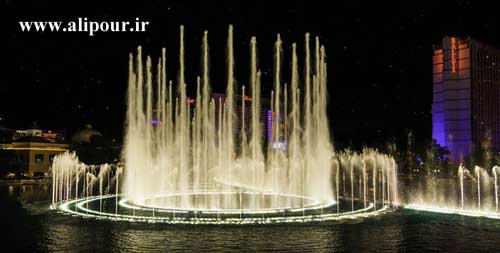 "آبنمای موزون با نور و موزیک","آبنما","نور و صدا","ساختمان","معماری","طراحی","دکوراسیون","هتل"