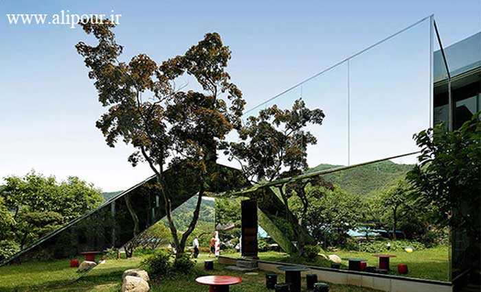 در طراحی و معماری گالری کوزه های jung gli-young از پانل های آینه برای نما استفاده کردند و با این کار طبیعت زیبای اطراف ساختمان وارد گالری می شود. استفاده از آینه ها در طراحی نمای ساختمان، هارمونی و تعادل را وارد مجموعه کرده است.